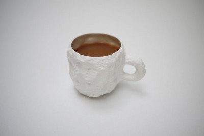 The process of slip-casting begins with the creation of a three-dimensional model of the design known as a ‘master’ by a professional model-maker, from which the production mould is cast. Crockery bypasses this process by placing the responsibility of both designer and model-maker in the hands of Max Lamb. Using the tools of a stone mason Lamb chips and carves a solid block of plaster to make a jug, bowl